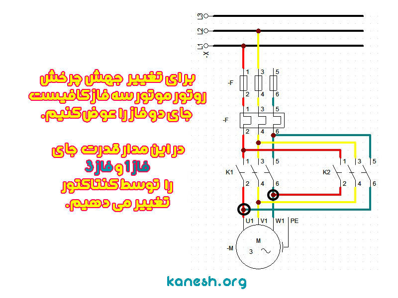 برای تغییر جهت، دو فاز ورودی (مثل L1 و L3) را تعویض میکنیم. این کار با کنتاکتور یا کلید گردان انجام میشود.