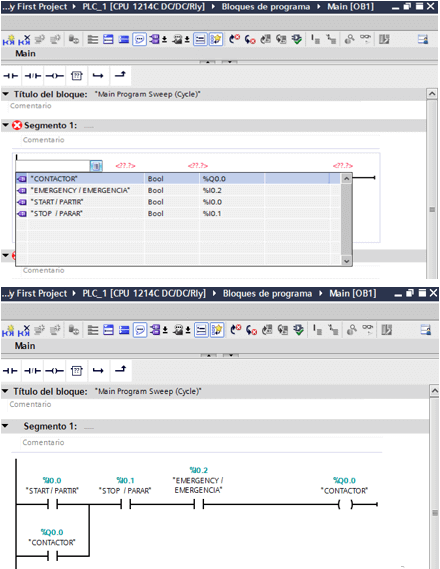 Ladder: Start → Motor, Stop → NC